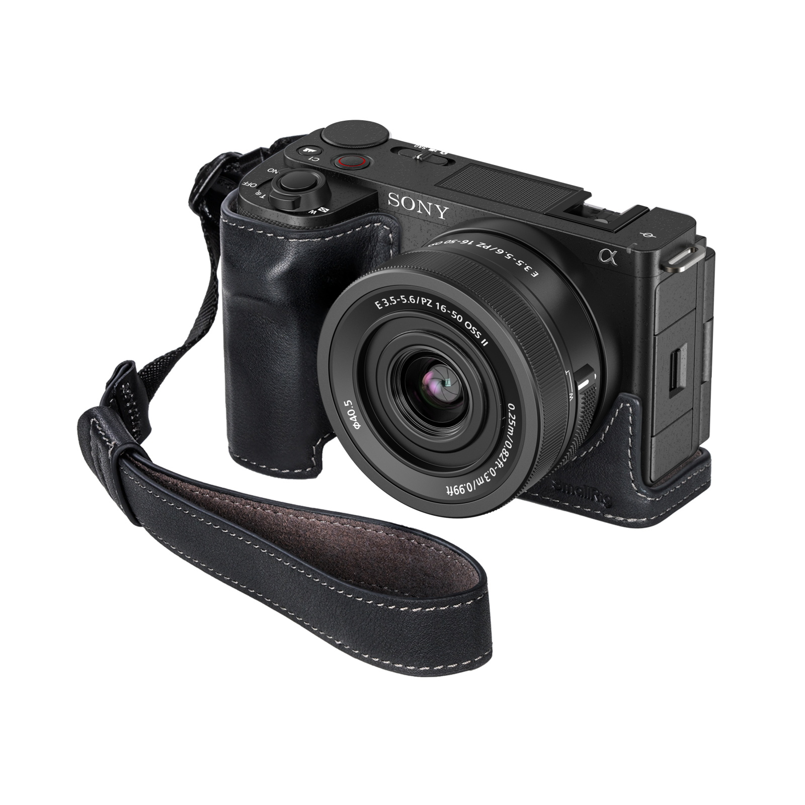 O kit de estojo de couro para câmera SmallRig para Sony ZV-E10 II foi projetado para proteger sua câmera, preservando seu charme clássico. O kit inclui um estojo de couro e uma alça de pulso, ambos confeccionados em couro legítimo durável e respirável. A empunhadura de espuma integrada proporciona uma pegada ergonômica com segurança adicional, enquanto o forro interno macio protege a câmera contra arranhões. Um parafuso de aperto manual de 1/4"-20 na parte inferior permite a montagem da câmera sem ferramentas. O design do estojo garante acesso desobstruído às interfaces e botões da câmera, como o compartimento da bateria, o modo de foco e o slot para cartão.